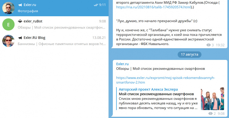 Раньше обновления шли в телеграм-канал Exler.RU Blog. Но с 13 числа постинг туда почему-то прекратился. Почему - я не знаю, этот канал создал один читатель, я туда доступа не имею. При этом у канала было более тысячи подписчиков, то есть части читателей было бы удобно продолжать получать информацию об обновлениях на сайте через телеграм-канал.