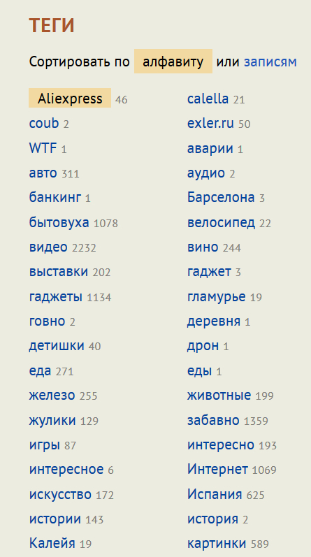 В блоге в каталоге тегов сделали две разных сортировки - по алфавиту и по количеству записей. А то раньше все было по количеству записей, нужный тег было сложно искать. С алфавитным задача сильно упрощается.