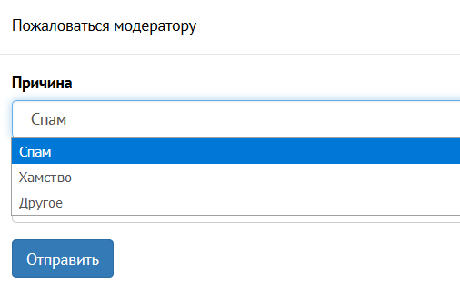 При нажатии открывается окно и можно выбрать из списка три варианта: "Спам", "Хамство", "Другое".