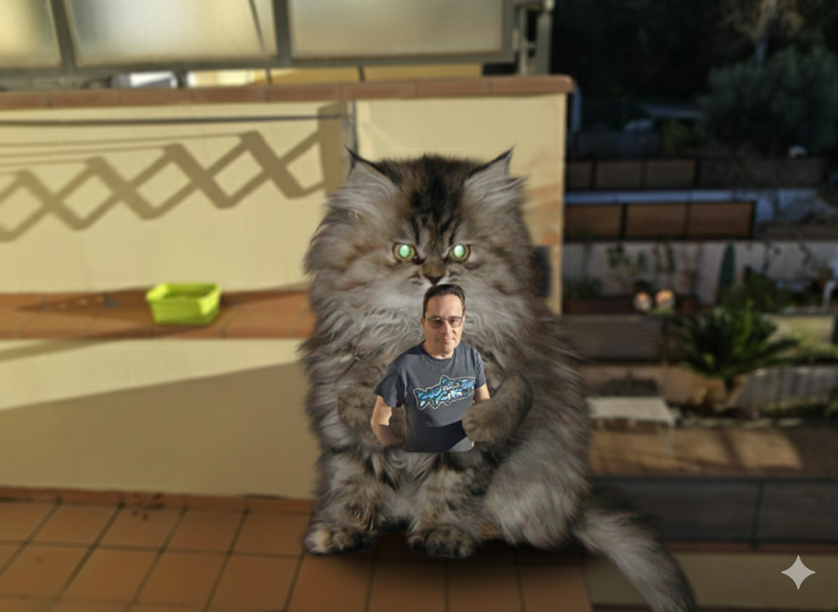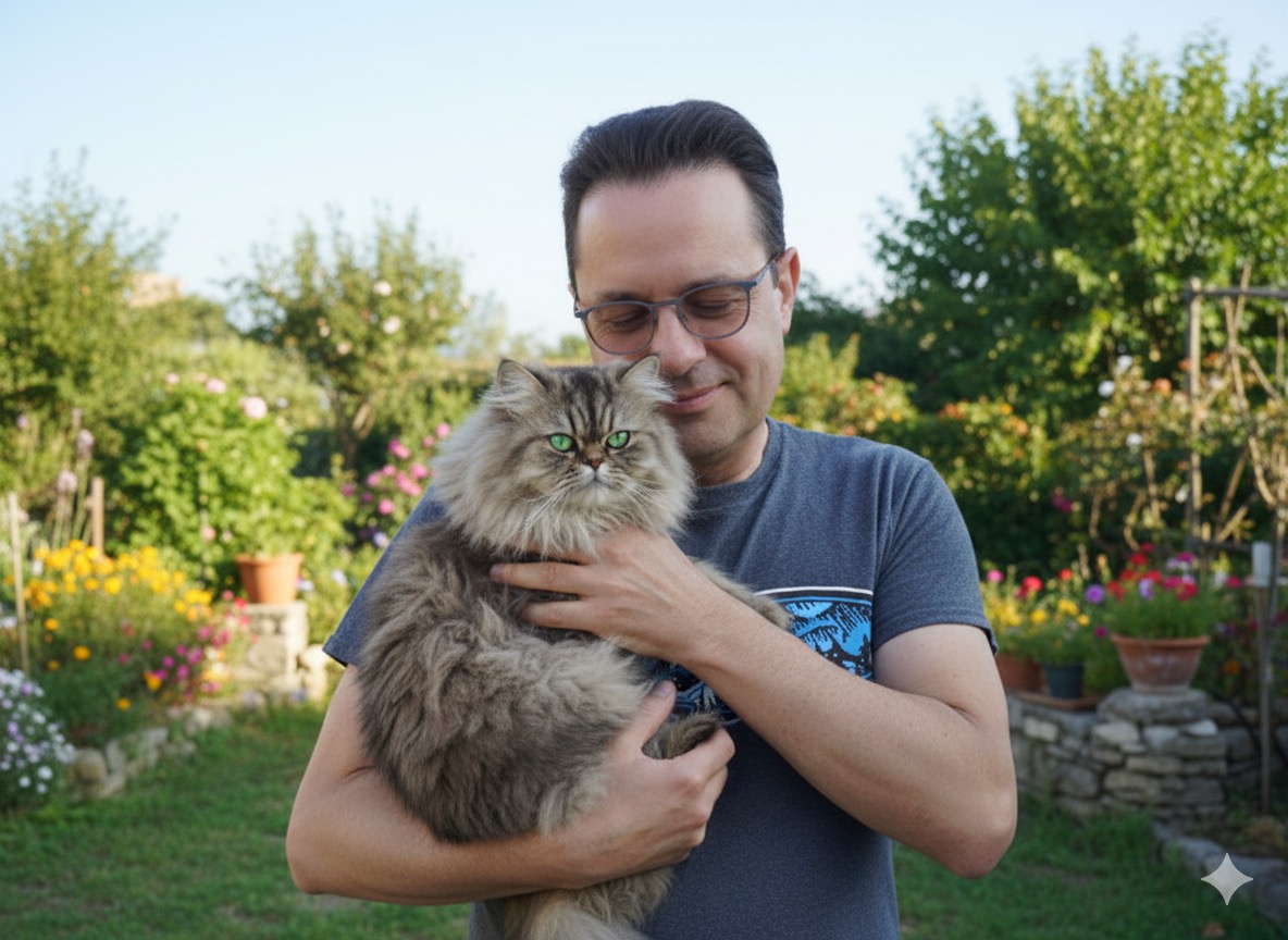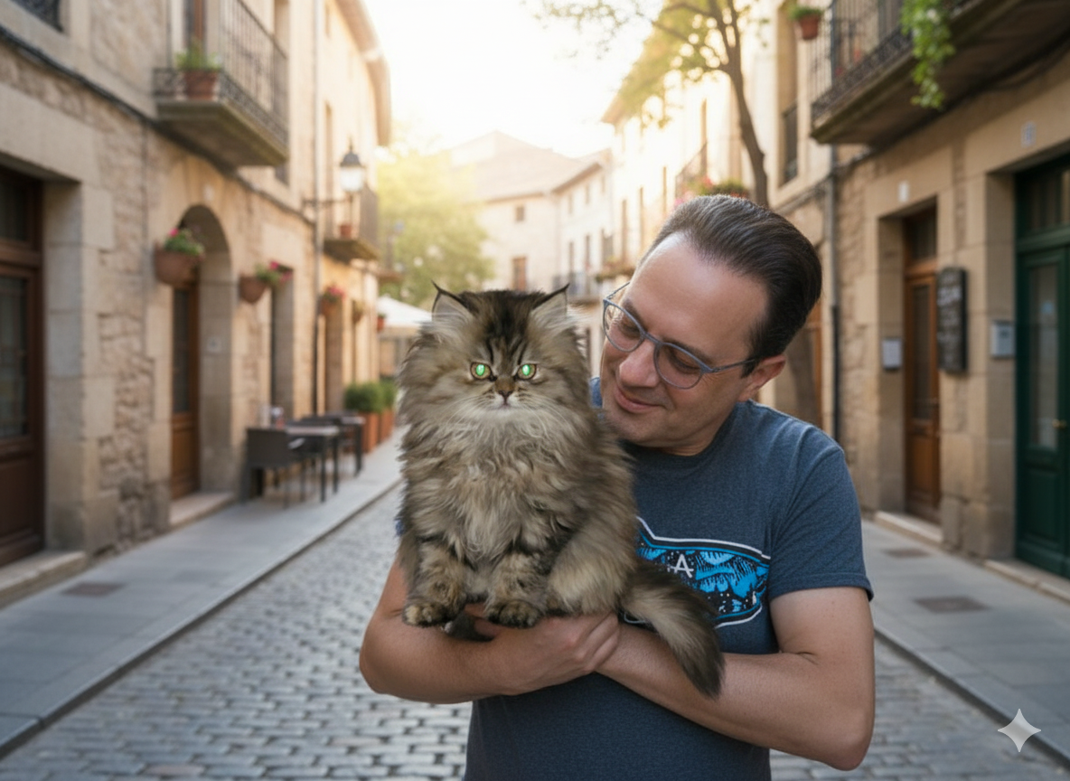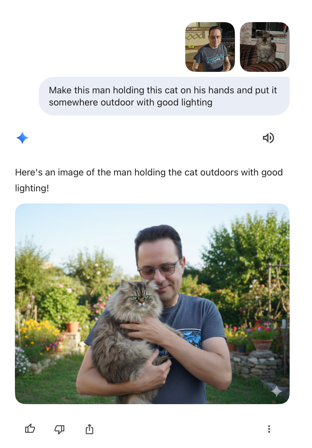 Для начала загрузил свое фото, фото кошки и попросил, как в рекламном ролике, посадить кошку мне на руки и поместить нас в какое-нибудь хорошо освещенное место на улице.