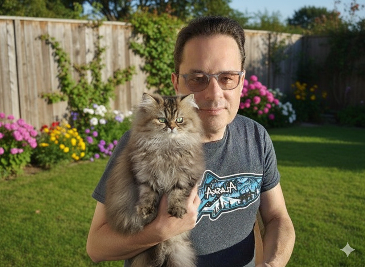 То же самое попросил сделать ChatGPT, причем заново загрузил свою фотографию. Он поменял, но все равно меня сделал с кошкой на руках. И физиономию тоже исказил - в статье были правы.
