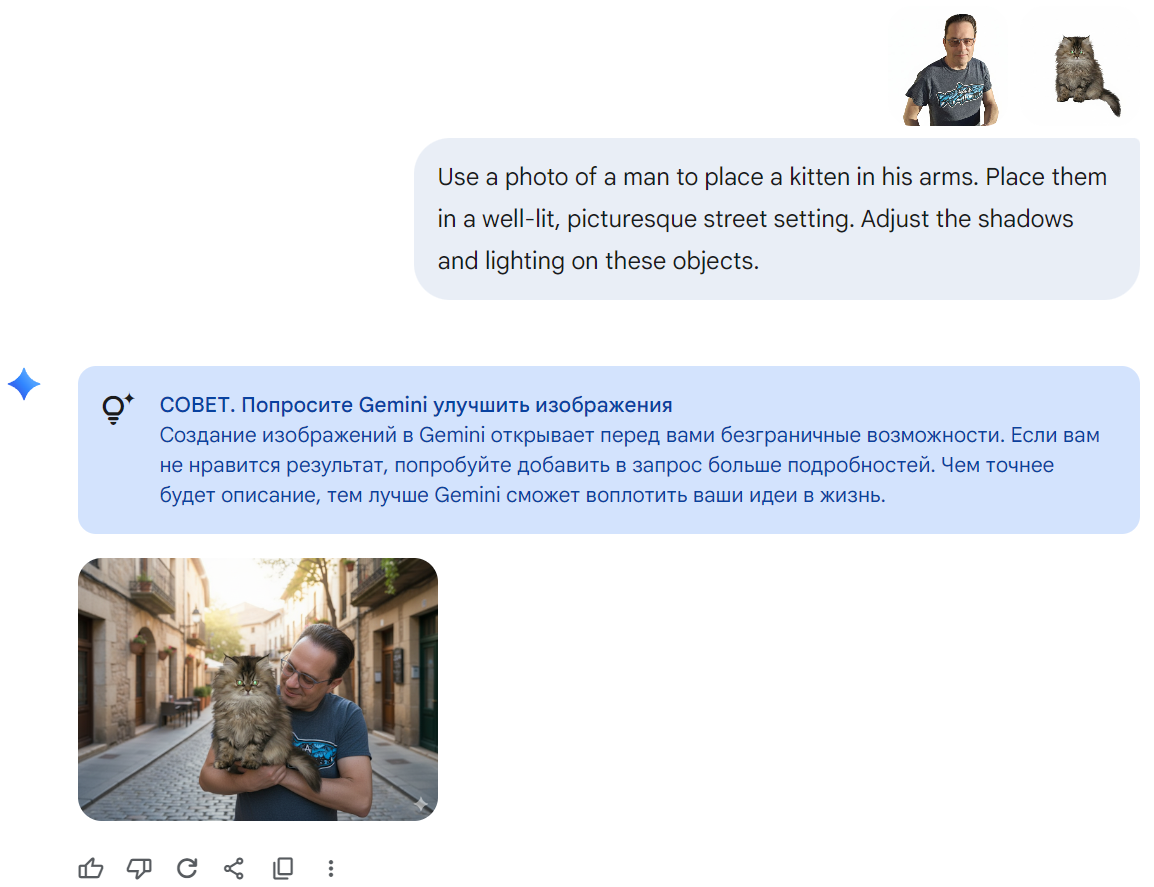 Вот, что получилось с таким вторым промптом: «Use a photo of a man to place a kitten in his arms. Place them in a well-lit, picturesque street setting. Adjust the shadows and lighting on these objects.» В первом промте я попросил удалить фон у котенка и мужчины.