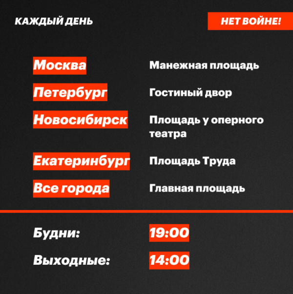 Собирайтесь на площадях каждый день: в будние дни — в 19:00, в выходные — в 14:00. Вот конкретные точки сбора для крупных российских городов. Следите за нашими соцсетями — там будет появляться информация о местах в других городах. И организуйтесь сами.