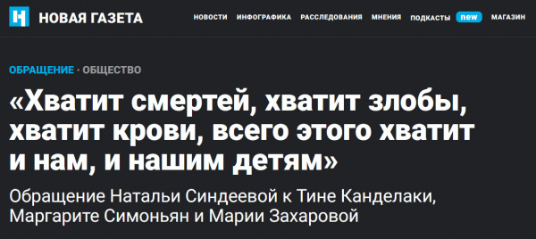 Обращение владелицы и генерального директора медиахолдинга "Дождь" Натальи Синдеевой к Тине Канделаки, Маргарите Симоньян и Марии Захаровой - "Хватит смертей, хватит злобы, хватит крови, всего этого хватит и нам, и нашим детям".