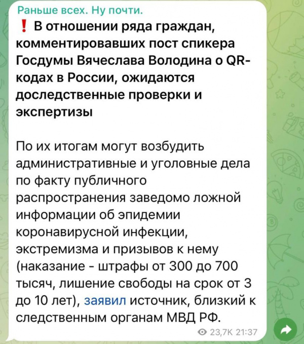 Судя по статистике телеграма на момент публикации этой заметки, пост Володина прочитали 325 тысяч человек, под ним оставлено более 210 тысяч комментариев. Многие пользователи высказывают резко отрицательное отношение к возможному введению QR-кодов в России. (Отсюда.)
