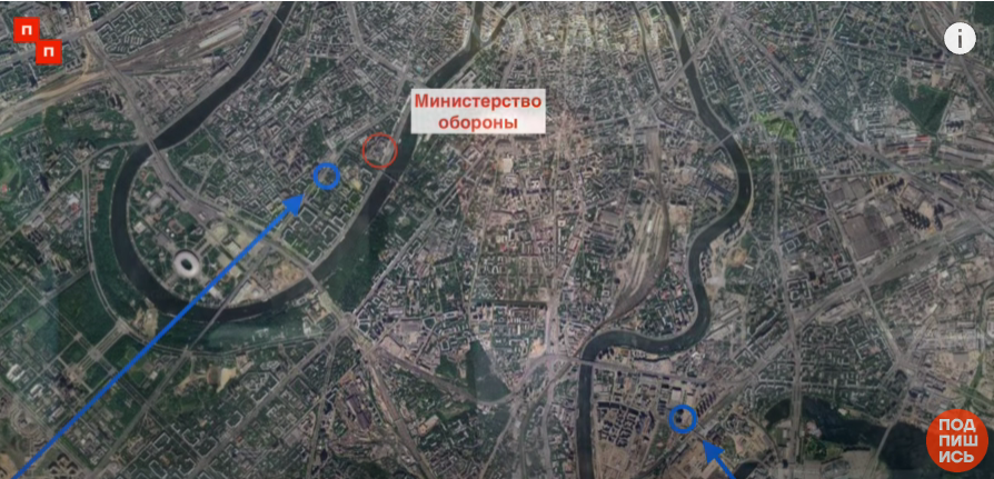 места, где упали 2 сбитых дрона в Москве, с траекториями, экстраполированными на ситуацию, если бы не сбили.
