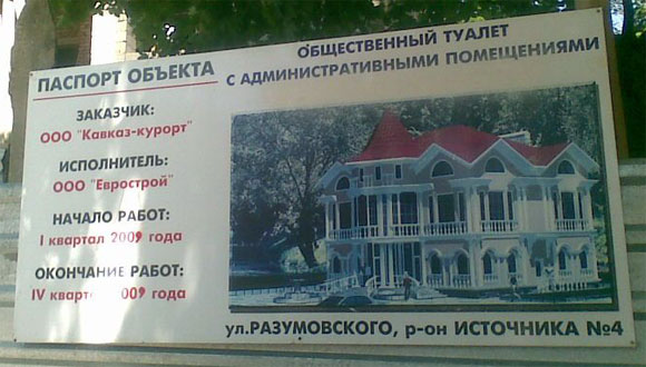 На Кавказе (Ессентуки) местные строители - не только до предела циничные, но и веселые. Получили разрешение на постройку общественного сортира - его и строят. Только с административными помещениями.