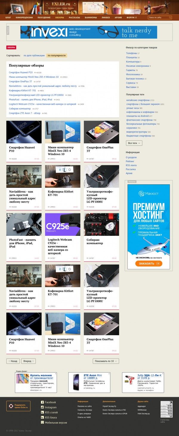 Главная страница. Здесь стояла задача, с одной стороны, сохранить текущую схему навигации, но, с другой стороны, добавить какое-то количество анонсов, чтобы это все выглядело именно как главная страница, а не как просто оглавление, совершенно не привлекающее внимание человека, который понятия не имеет, что такое Exler.ru.