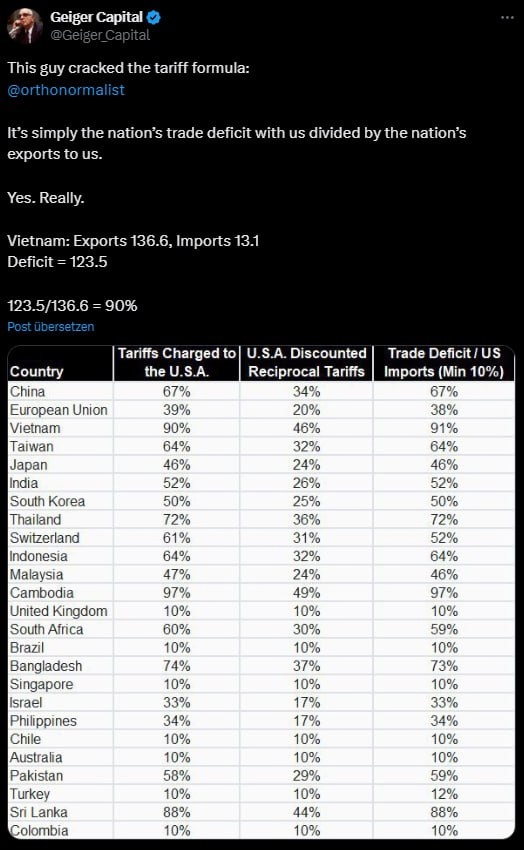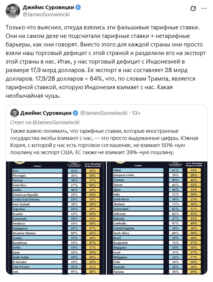 "Первая циферка в табличках Трампа, которая названа пошлиной страны по отношению к США, - это торговый дефицит, деленный на экспорт этой страны в США. Результат переведен в проценты и сделан не меньше 10%.