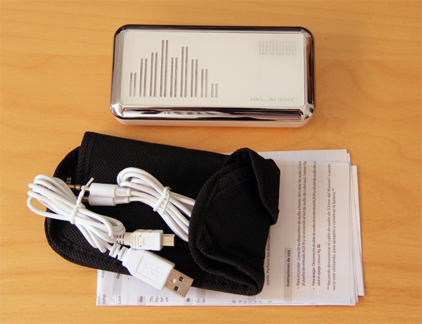 Дебоксируем это дело. Внутри сама колонка, аудиошнурок, шнурок miniUSB-USB, чехол и короткая инструкция.