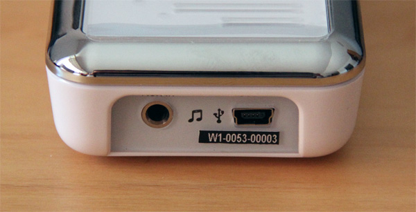 С торца - вход стандартного аудиоджека 3,5 мм, miniUSB. (Жалко, кстати, что не microUSB.) Когда колонка подключается к источнику аудио, загорается значок с нотами. Когда подключается к питанию - соответственно загорается значок USB.