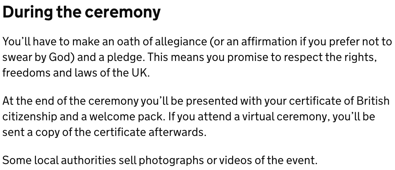 Повторяешь вслух за работником городского совета короткий (несколько предложений) текст клятвы, после чего тебе дают на руки свидетельство (сертификат).