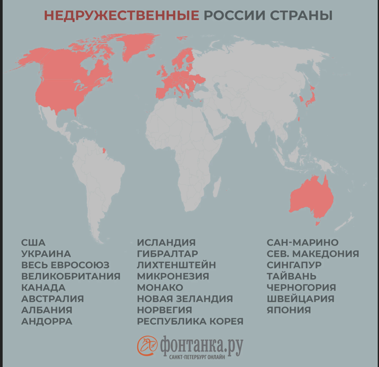 Ранее в список недружественных России стран были включены все страны Европейского союза, а также: