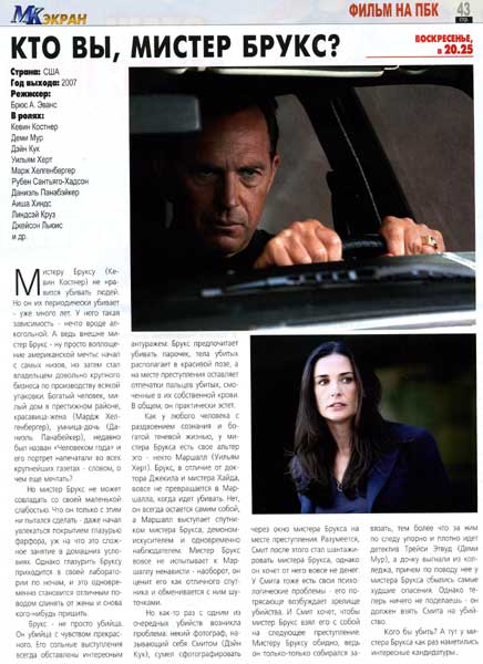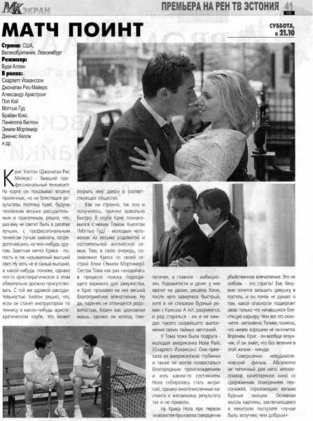 Как классно устроились ребята из эстонского русскоязычного издания "МКэкран". В каждом номере публикуют мою рецензию - разумеется, без указания имени автора. Причем рецензии еще и кастрируются - то есть публикуют только первую часть, где кратко о сюжете, ну и прилепливают в конце пару абзацев из раздела рецензии с моими впечатлениями. Иногда еще от себя что-нибудь квакнут, что особенно бесит. Причем ругательные рецензии не публикуют - например, рецензию на совершенно отстойных "Бандиток" переть не стали, зато опубликовали чье-то море слюней восторга по поводу этого кинца.