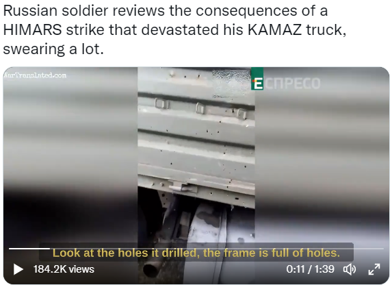 видео интересно тем что до сих пор США официально не подтверждали, что поставляют Украине GMLRS с "альтернативной боеголовкой" — то есть боевой частью с вольфрамовыми шариками. Стрелять ими по одиноко стоящему КАМАЗУ, разумеется, расточительство. Но вот при попадании в скопление живой силы противника, даже защищённому легкой бронёй, они становятся небольшим таким оружием массогого поражения