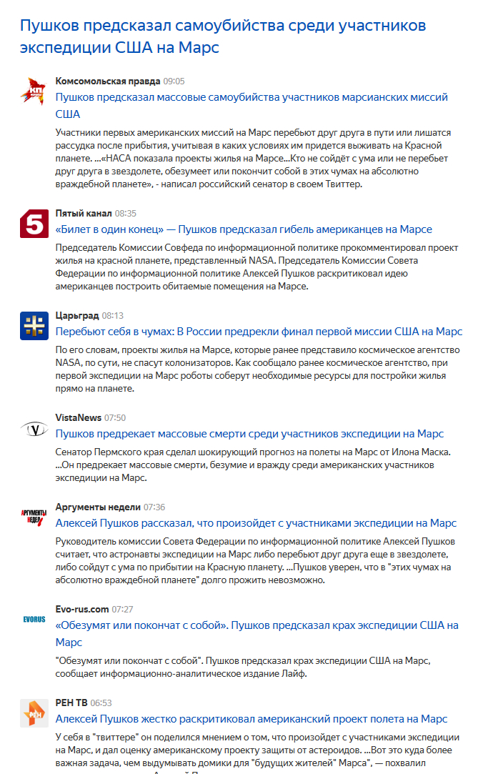 Ну что, отечественная новостная журналистика с блеском пробила очередное днище. Какой-то там член Совета Федерации Пушков, политолог, ночью спьяну что-то там квакнул в своем твитере по поводу марсианской программы НАСА, в которой он понимает чуть меньше, чем ничего, а утром это одна из главных новостей дня - Яндекс выдает порядка 20 основных источников, причем среди них главные федеральные СМИ.