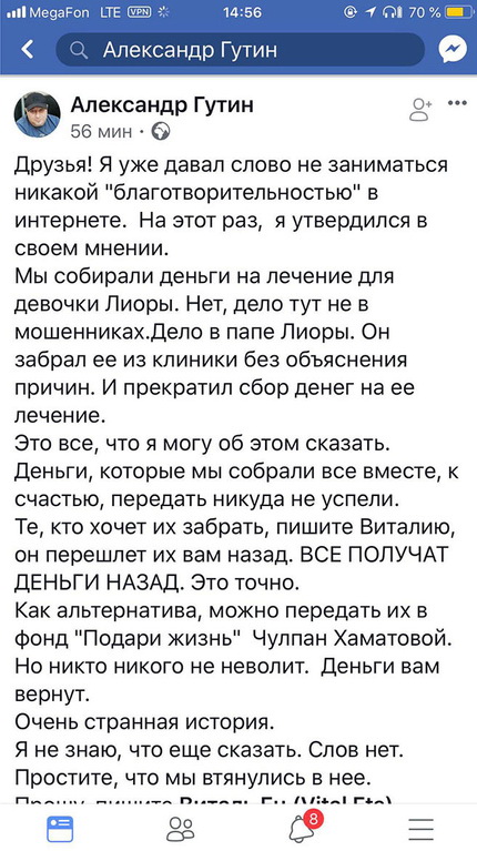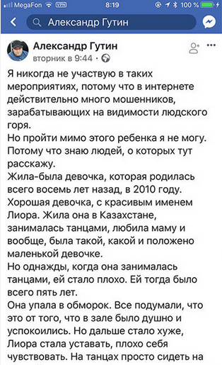Суть в том, что пост о помощи некоей Лиоре Алиевой разместил блогер Александр Гутин, у которого в Facebook 44 тысячи подписчиков. И он утверждал, что лично знает людей, о которых пишет. (Это логично, я тоже пишу о подобных случаях только когда лично знаю людей, для которых собирается помощь.)