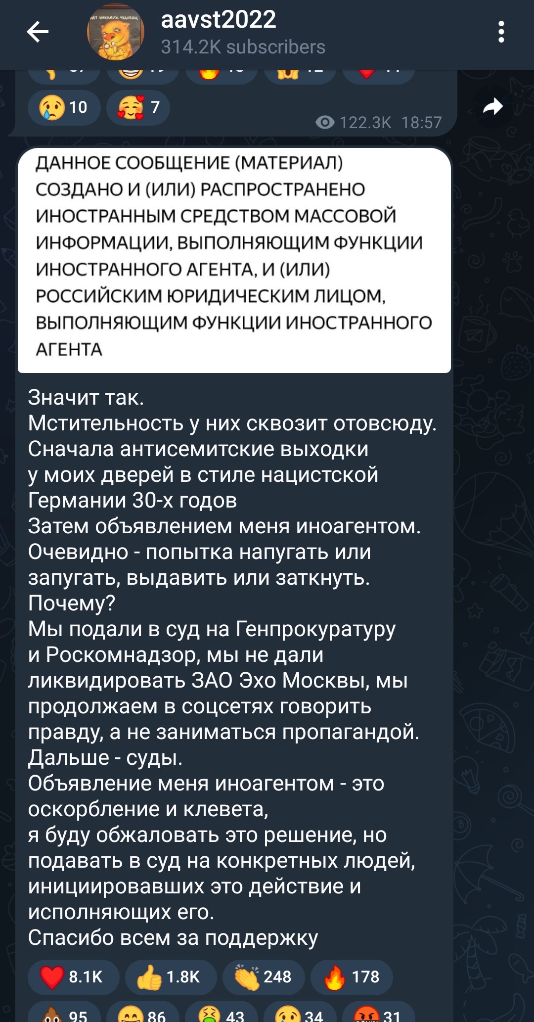 Отреагировал https://t.me/nevzorovtv/4764 на признание его иноагентом и Александр Невзоров: