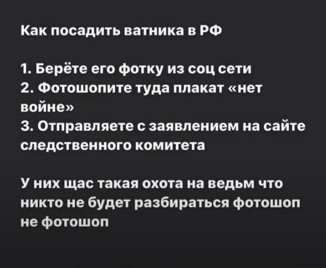В России вообще можно обсуждать текущую ситуацию только словами пропагандонов, других вариантов уже нет. Мне прислали объявление на форуме одного из российских городов. Все четко и понятно - или говоришь словами соловьиного дерьма, или уголовочка. И не забывайте, что "Нет войне" - это дискредитация использования Вооруженных Сил РФ. Главное - это не забывать!