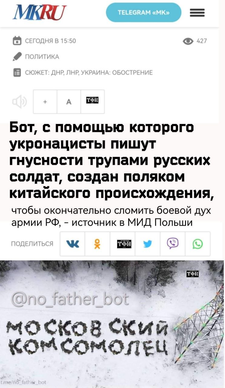 В телеграм-боте "Папка в пакете" можно задать любой текст, который будет "выложен трупами российских солдат". В российских говноСМИ об этом до сих пор не знают, поэтому постоянно получают богатейший материал для гневных статей в адрес украинских жидо-бондеровцев.