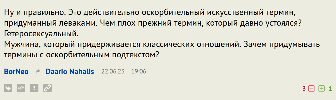Уже появились запретные слова ("цис", "цисгендер") с оправданием запрета один в один, как было при предыдущих владельцах. Там токсичные правые оскорбляли своими словами, поэтому их надо было запрещать, а теперь уже леваки оскорбляют своими словами, поэтому такие слова тоже нужно запретить на улицах, ограничив кухнями.