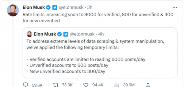 Пошел выяснять. Выяснилось, что Маск ограничил просмотры в Твиттере следующим образом: