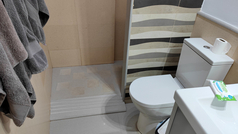 Есть там уклон конечно же. Это стандартный поддон из Леруа Мерлен, там есть уклон в сторону слива, просто не сильный. При достаточной пропускной способности сливной трубы было бы все ок. Но в Испании трубы на слив обычно очень тонкие, поэтому вода уходит не так быстро как нужно и всегда часть переливается через край поддона. Плюс брызги, которые тоже летят за край, если в этом месте нет дверки стеклянной либо шторки.