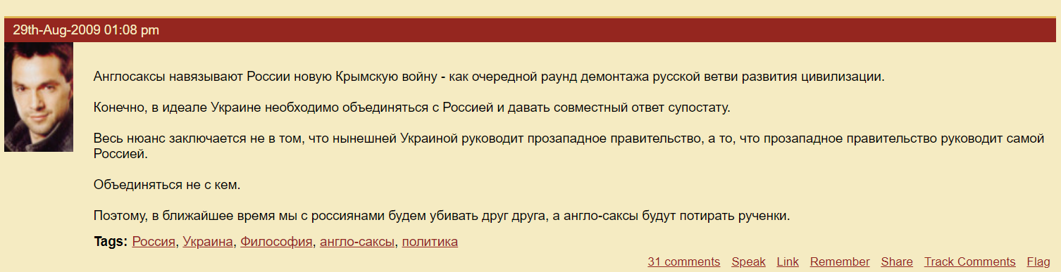 Если кратенько и тезисно, то он был (казался) проукраинским, а стал пророссийским. Если человек, живя в Украине, видя Бучу, Мариуполь и пр. способен совершить такой фундаментальный кульбит, то пошёл он к чёрту. Вот и весь мой тебе тезис.