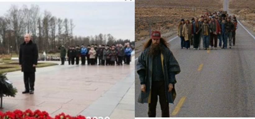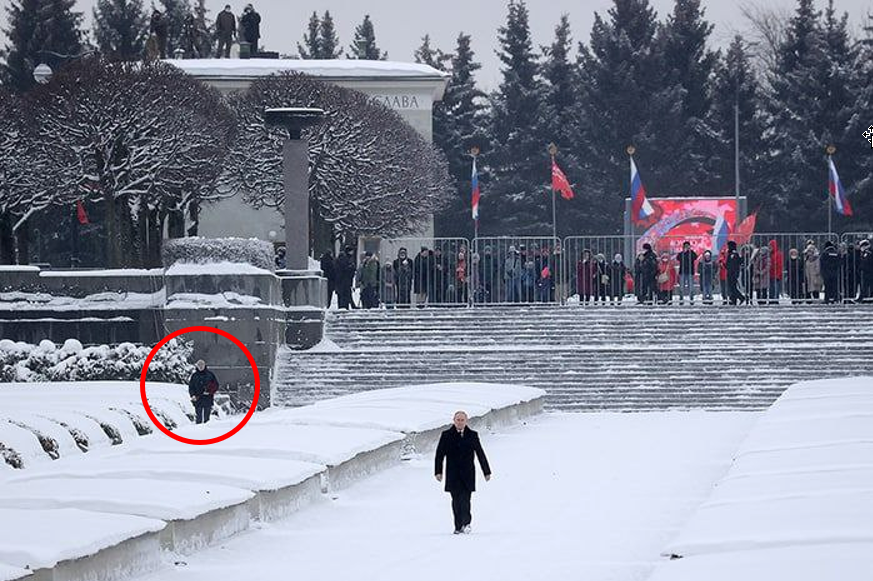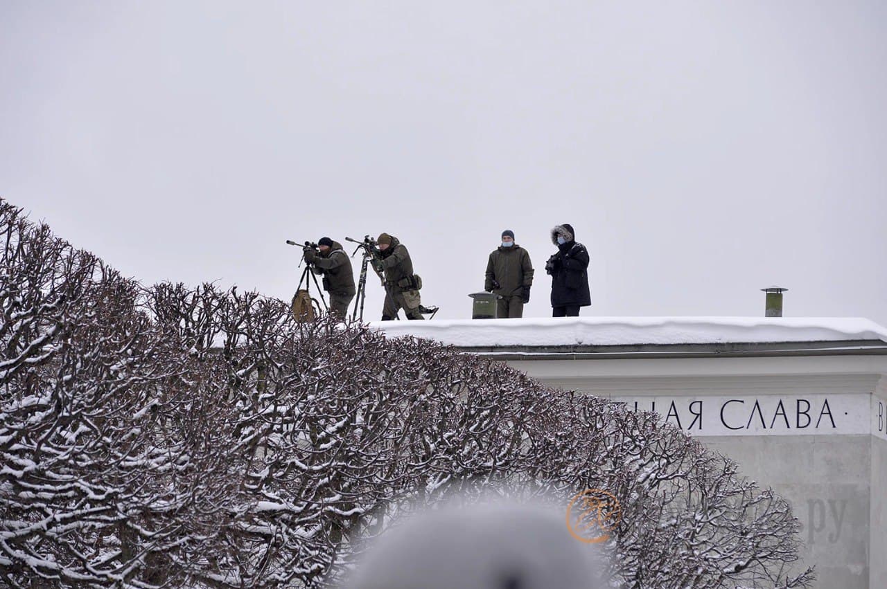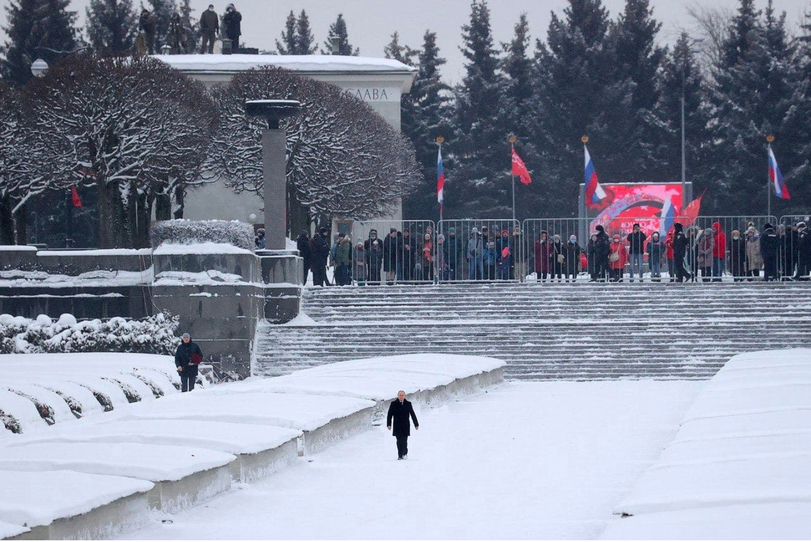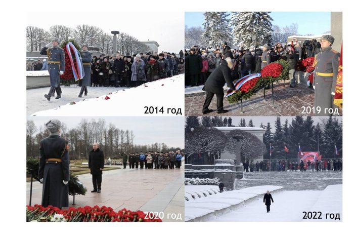 Владимир Путин приехал возложить цветы на Пискаревское кладбище в Петербурге в честь 78-летия освобождения города от блокады. Вокруг все окружено снайперами, кладбище за сутки начали проверять ФСО-ники, одетые бомжами и кладбищенскими работниками, при этом во время церемонии тех самых блокадников на кладбище не пустили и оставили за забором наблюдать через решетку за президентом.