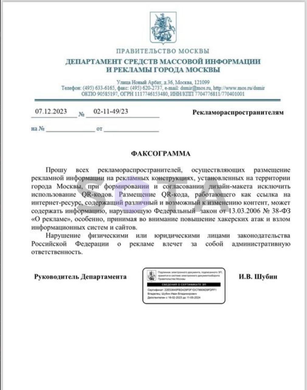 Соответствующую факсограмму Департамент СМИ и рекламы города направил в компании, распространяющие наружную рекламу. В документе говорится, что QR-код ведет на интернет-ресурсы, которые содержат «различный и возможный к изменению контент». Власти Москвы опасаются, что из-за этого QR-коды могут содержать информацию, нарушающую закон «О рекламе».