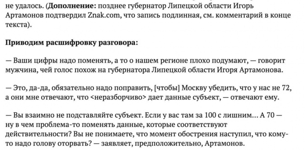В телеграм-канале "Хомутнинников" опубликована аудиозапись разговора предположительно губернатора Артамонова и его заместителя Ильина. Люди обсуждают, какую статистику по заболеваемости коронавирусом нужно предоставить Москве. Речь идет о том, что нужно предоставить ту цифру, которую от них ждет Москва, потому что - зачем подставлять субъект и расстраивать Москву, правильно? В чем проблема поменять-то?