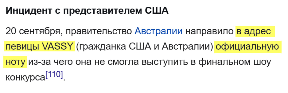 От Штатов должен был выступать какой-то никому не известный чувак, но и у того возникли "семейные проблемы", и он соскочил. Тогда нашли какую-то Vassy, у которой кроме американского оказалось еще и австралийское гражданство, и из Австралии ей вежливо намекнули, что если она попрется в этот Мордор, то... В общем, ей лучше туда не переться. Она и не поперлась.