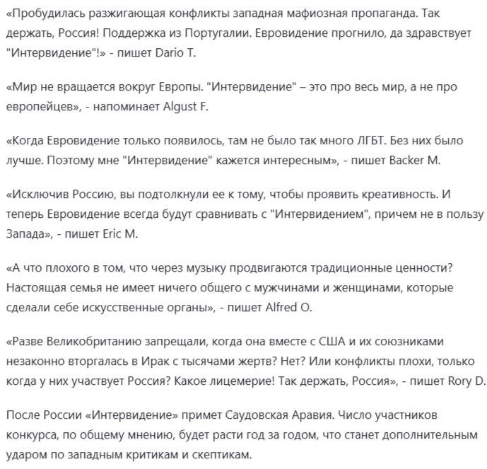 Все эти годы Россия обвиняла Евровидение в политизированности. «Они голосуют не за песни, а за политику», твердили эксперты в эфире «Пусть говорят». Теперь мы получили свой собственный аналог, в котором кроме политики и пропаганды нет вообще ничего.Если в Большом театре оперу «Семен Котко» ставит сотрудник Администрации президента Сергей Новиков, то на финальном занавесе зритель получает цитаты из методички про Донбасс. Surprise-surprise: Интервидение курирует он же, Сергей Новиков. Когда-то собирался стать скрипачом, но не хватило таланта. Теперь создается ощущение, что он мстит искусству. История уже видела, как неудавшиеся художники превращали личную обиду в инструмент власти и пропаганды. Что нам ждать, если проектом занимается чиновник из администрации.На Интервидении Россию представляет Шаман, сам по себе политический проект. Конкурс открыл Владимир Путин речью о свободе и культуре, двух вещах, о которых он не знает ничего.Формат не нов: Интервидение – это реанимация умершего советского проекта. В 70-е оно создавалось как «анти-Евровидение». Но соцлагерю не удалось превзойти оригинал, и конкурс закрыли из-за тотальной непопулярности. Сегодня вокруг России никакого единого лагеря нет, поэтому список стран напоминает содержимое холодильника после праздника, доедаем все, что осталось. Бывшие советские республики вперемешку с Саудовской Аравией, Катаром, ОАЭ, Кубой, Венесуэлой и, конечно, Беларусью. Общий знаменатель прост: все, кто не отвернулся от агрессора во время войны.Попробуем покопаться в музыкальной части, хотя не почти нет. В большинстве стран национальных отборов не проводили, отправляли кого-нибудь. Такое ощущение, что формат конкурса это музыка из Uber. Представьте вы прилетаете в Эмираты, на Кубу или в Таджикистан, салидеть в такси в аэропорту и водитель фоном включает какое-то местное радио, примерно так выглядят все конкурсанты. Просто какие то национальные напевы на родном языке.Без скандалов не обошлось. Китайский артист прислал кавер 20-летней давности. Египетский отправил тоже древний трек, а когда это обнаружили, просто удалил его со всех носителей и перезалил заново, превратив в песню 2025 года. Гениально! Американская линия – отдельная ирония. Артисты, заявленные от США, сорвались в последний момент. Vassy отказалась прямо во время трансляции, сославшись на форс-мажор. Форс-мажором оказалось её австралийское гражданство. Ведущие тут же заговорили о «политическом давлении», которым они шокированы, ведь где это видано, что бы политика и государство вмешивались в культуру. И это в стране, где режиссеры, драматурги и художники сидят в тюрьмах за позицию, а в театральных программах имена неугодных заменяют на безымянное «режиссер». Так, например, исчезло имя Алексея Ратманского в афишах его балет «Светлый ручей» в уже упомянутом Большом театре.Чтобы повысить статус конкурса, российское ТВ раскачивает новость о солисте Deep Purple, который якобы представляет США в жюри. Это не тот, о ком вы думаете, а Джо Линн Тёрнер, он, правда, давно живет под Минском, поддерживает войну, выступал в Крыму. Но какая политика, о чем вы? Вот у нас тут еще и глава МИД Сергей Лавров с речью, какая политика, вы чего!Сам концерт выглядел как фестиваль тоски по совку. Полина Гагарина и Дима Билан открывают вечер кавером «На заре», песня 1987 года. Татьян