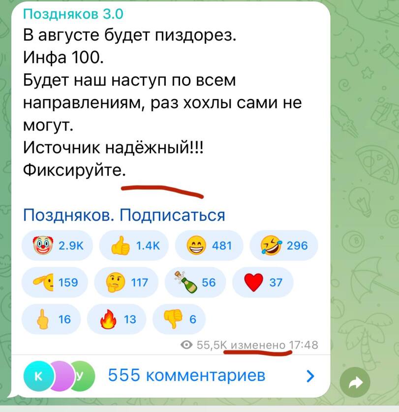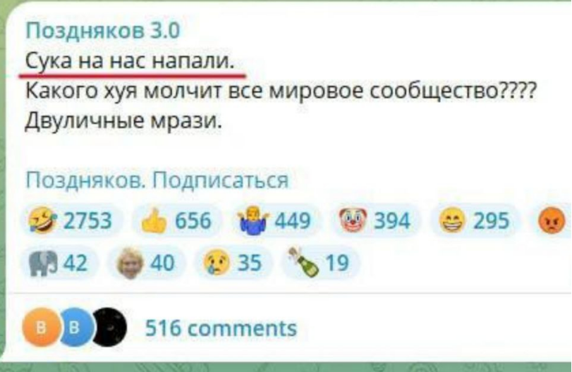А вот то что творится сегодня на московских улицах - это демонстрация полнейшего неуважения - и к тем, кто сейчас гибнет в окопах, и к тем жителям деревень, которые лишились абсолютно всего за последние три дня, а по большому счёту - ко всем регионам России, многие из которых уже отправили тысячи своих людей на фронт, и где жирующая и пирующая Москва воспринимается как прямое издевательство над ними как со стороны жителей столицы, так и со стороны центральных властей. Это полнейшая дискредитация власти, это демонстрация двуличности московских начальников , чьи дети, вероятно, тоже веселятся сейчас где-нибудь в столичных барах под развеселую музыку», - «G-RANGERS» (и репостнувший этот текст в свой канал на 614 тысяч подписчиков Михаил Онуфриенко).