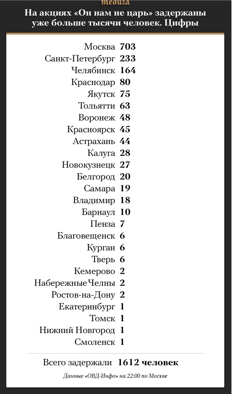 Вообще-то, по ссылке сходил 😶quot;В Москве на несанкционированной акции «Он нам не царь» задержаны около 700 человек (всего в стране — более 1600), в том числе инициатор акции, оппозиционный политик Алексей Навальный. "