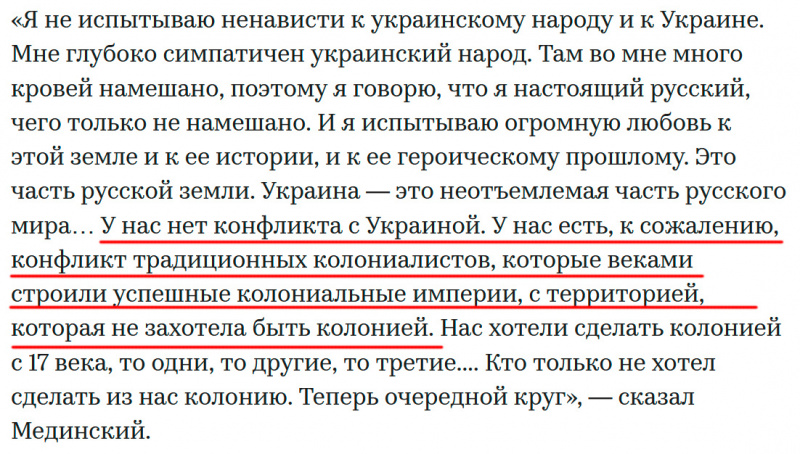 Все почему-то относят слова Мединского к Украине. Между тем он же говорит "НАС хотели сделать колонией". При этом Украина у него - неотъемлемая часть русского мира.