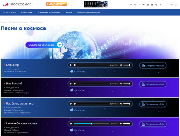 Госкорпорация «Роскосмос» открыла на сайте страницу с песнями своего гендиректора Дмитрия Рогозина. В разделе «Песни о космосе» можно прослушать онлайн, скачать и посмотреть клипы на песни главы госкорпорации, его жены Татьяны и других авторов.
