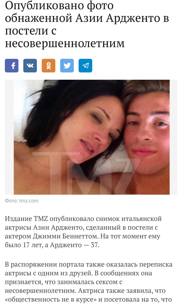 С интересом наблюдаю за ситуацией с актрисой Азией Ардженто, которая обвиняла Харви Уайнстина в изнасиловании, а теперь ее саму поразил синдром "Уайстина-Спейси": Азию обвинил в изнасиловании актер Джимми Беннетт, который в фильме "Цыпочки" играл ее сына. Он утверждает, что Азия его изнасиловала, когда ему было 17 лет.