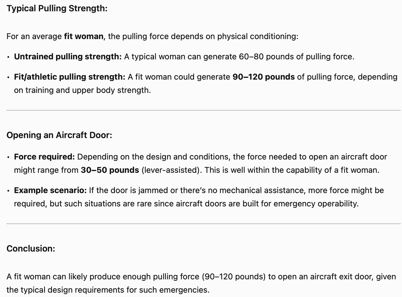 Ее может открыть любая стюардесса, даже самая хрупкая. Их этому учат. Пассажир ведь может запаниковать или застыть от страха в случае аварии.