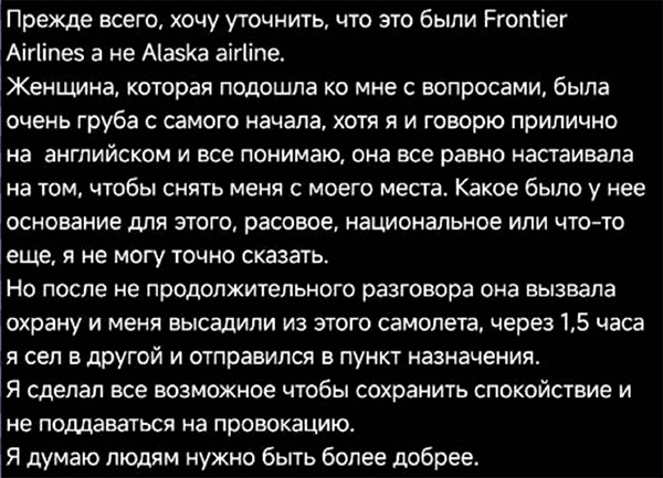 Ещё много лет назад у их конкурентов, Спирита, была история, как высадили русскоговорящих пассажиров, потому что бортпроводнице решила, что они громко разговаривают.
