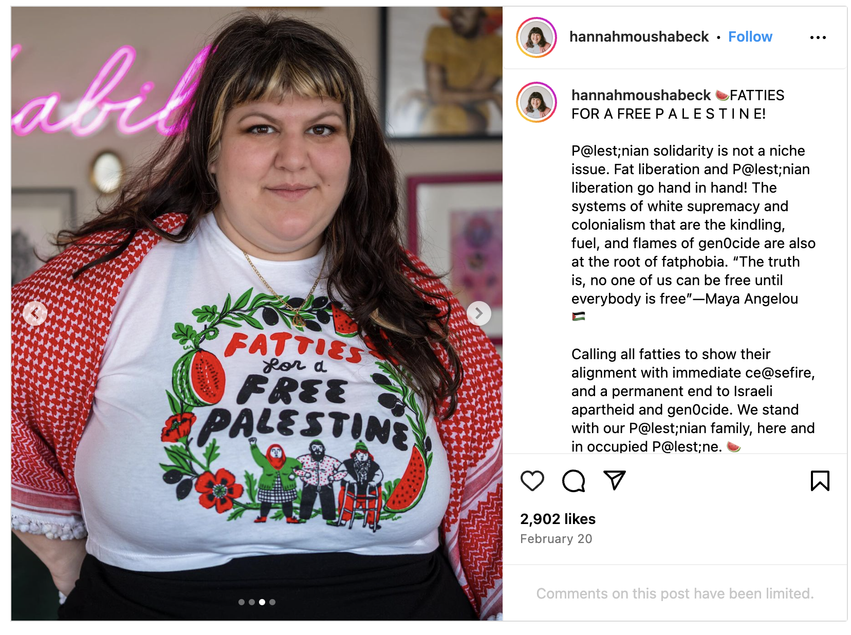 Солидарность палестинцев — это не узкоспециализированная проблема. Освобождение толстяков и освобождение палестинцев идут рука об руку! Системы превосходства белой расы и колониализма, которые являются растопкой, топливом и пламенем геноцида, также являются корнем фэтфобии. "