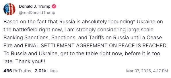 «Я думаю, что он делает то, что делал бы любой другой. Я думаю, он хочет, чтобы это прекратилось и уладилось, и я думаю, он бьет по ним сильнее, чем он бил раньше. И я думаю, любой на его месте делал бы это сейчас», — сказал Трамп в ответ на вопрос журналиста, считает ли он, что Владимир Путин получает преимущество из того, что США перестали делиться с Украиной разведданными.