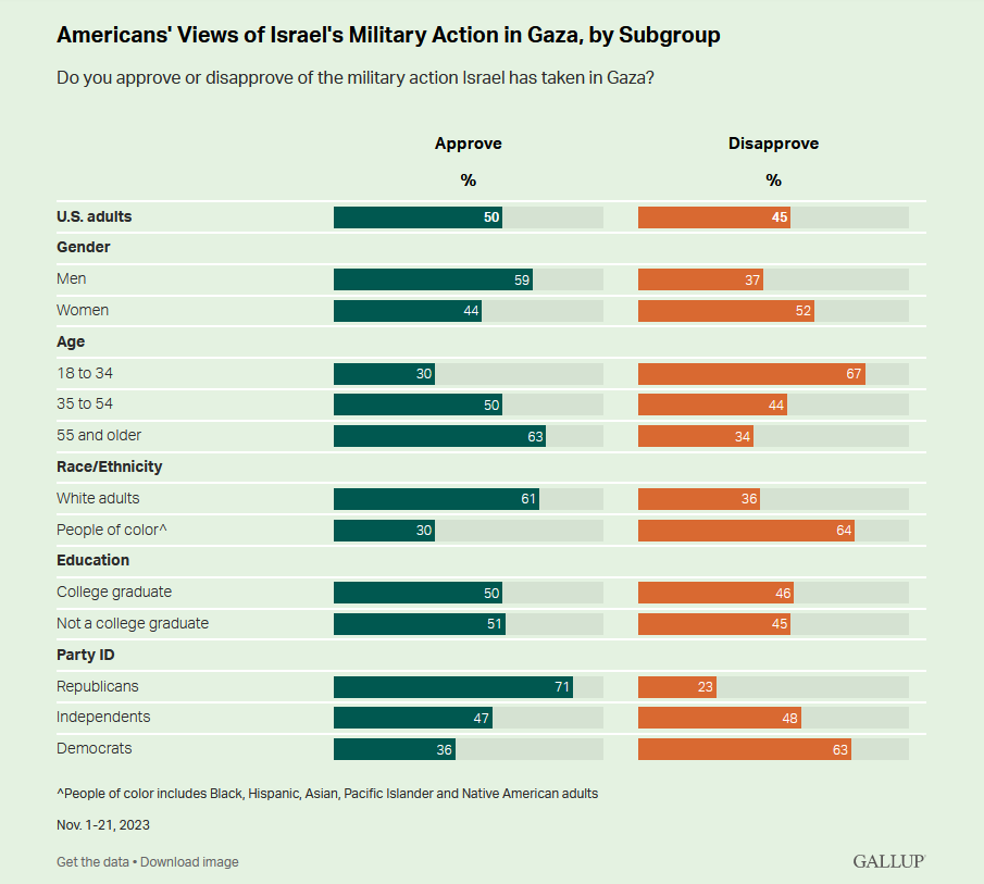 Опрос: Отношение к военной операции в Газе среди разных групп населения США (пол, возраст, раса, образование, партия) 30.11.2023