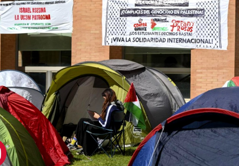 Студенты семи университетов Мадрида продолжают свои акции в защиту Палестины, увеличивая лагерь до 250 палаток, проводя занятия и семинары под открытым небом. Вместе со студентами выступают более 300 присоединившихся к ним преподавателей.