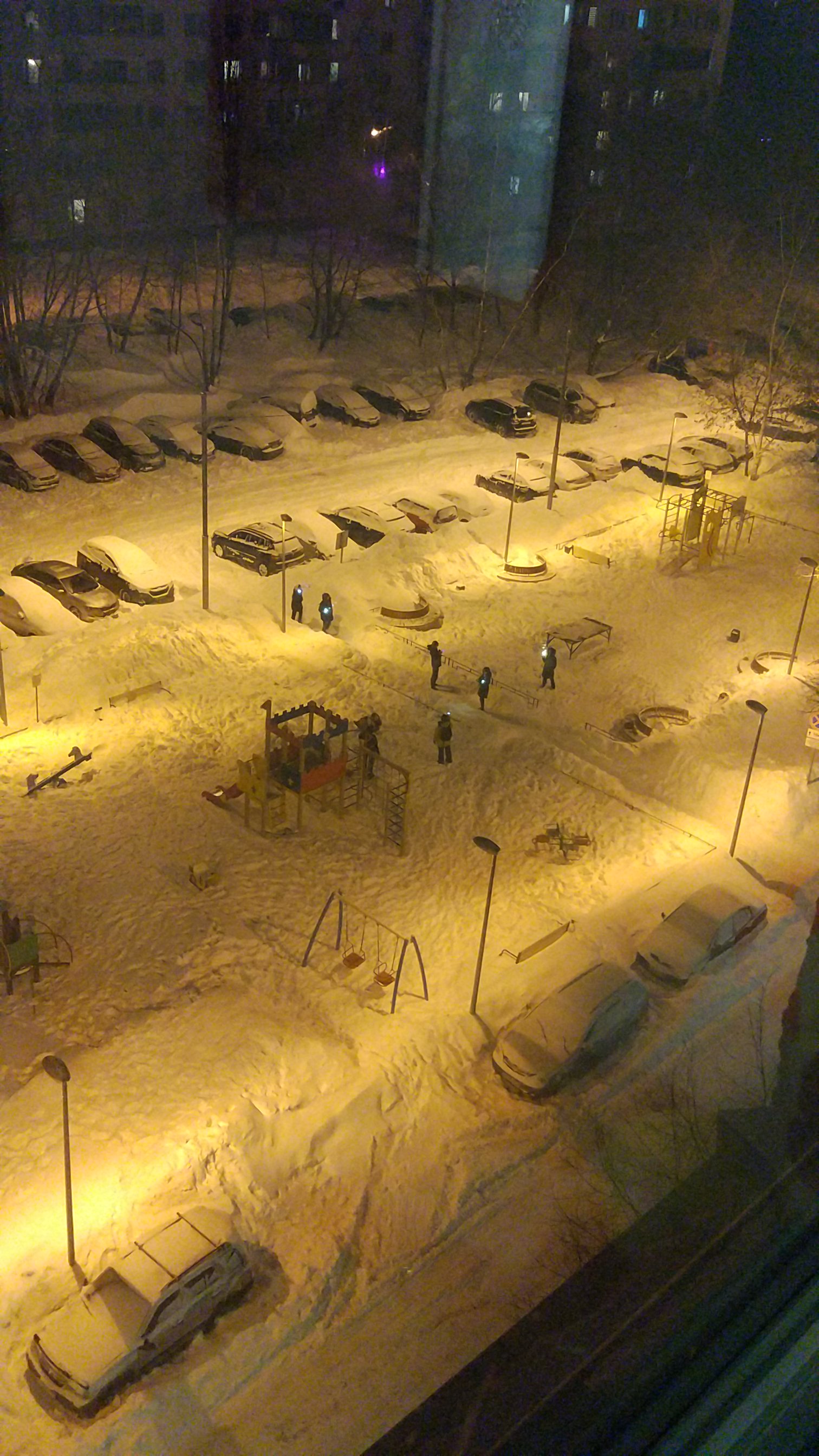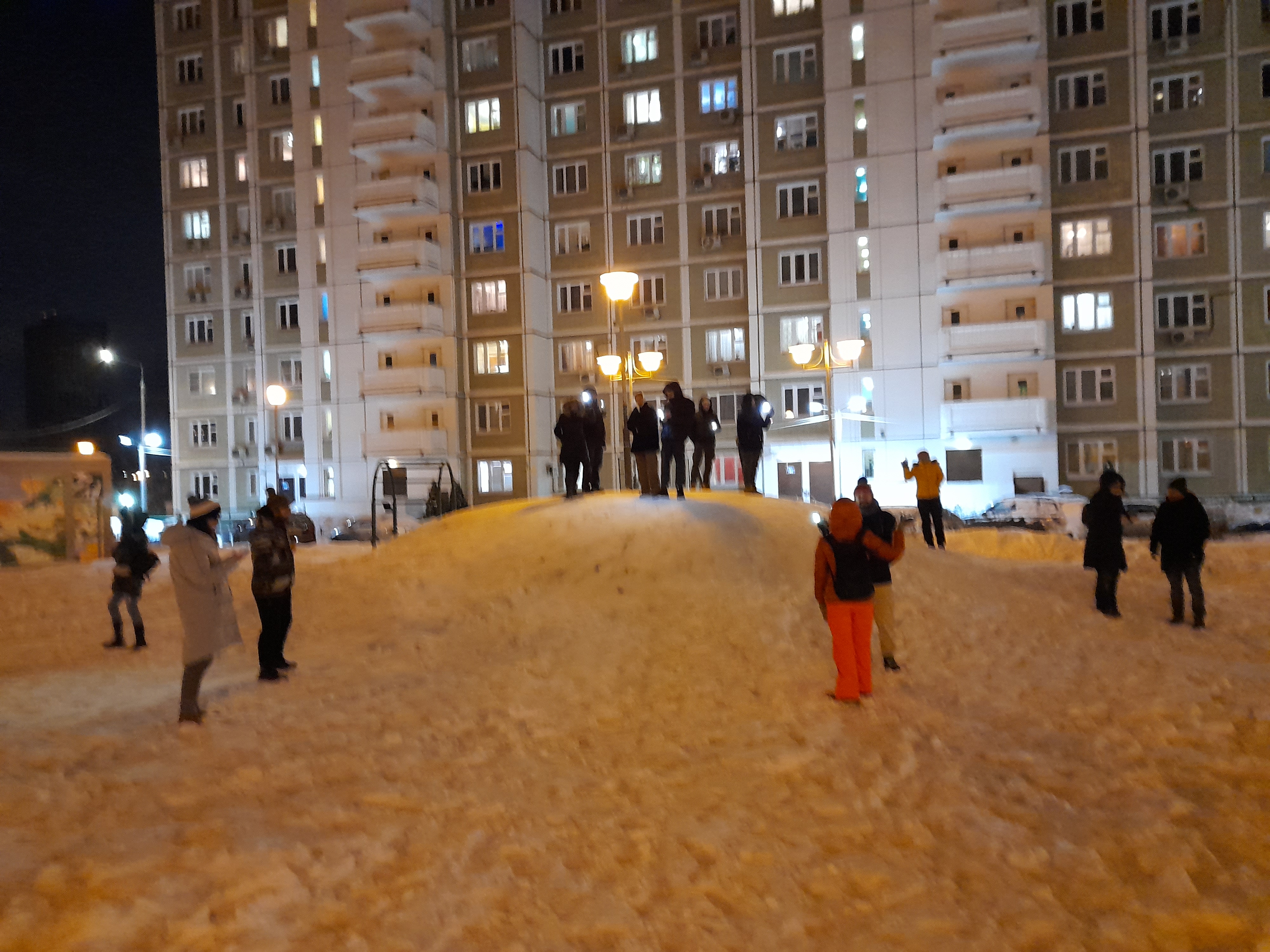 Москва. Во дворе постоянно стояли 5 человек, мимо человек 10 проходили с фонариками. Я не выходила, но с мужем посветили им в окошко, помахали.