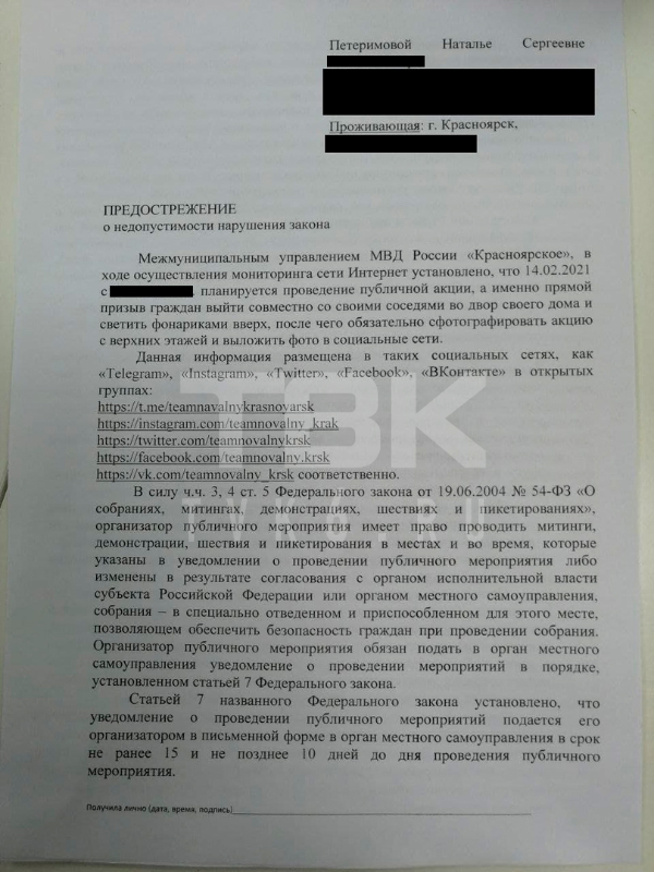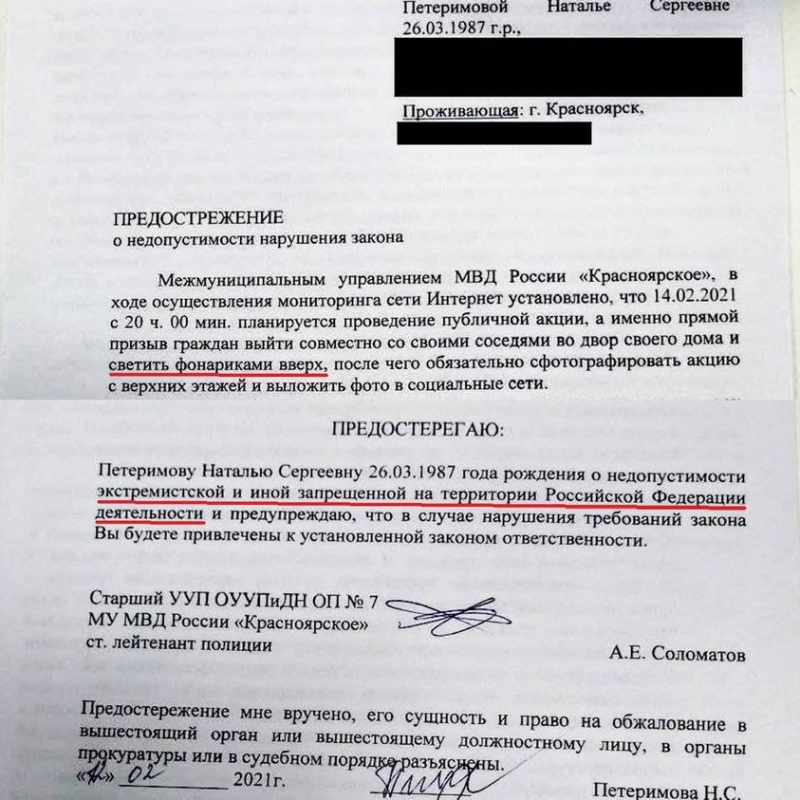 Глобально в предостережении ничего кафкианского не заметно - обычная бюрократия и отработка "сигнала". Впрямую из записки не следует, что свечение фонариком признается экстремизмом и запрещается. Засвеченного деятеля (видимо по предыдущим делам) предупреждают, что про акцию в курсе и предостерегают от каких-то иных действий возможно истолкованных как экстремистские. Вот, чтобы посветив фонариком не призывал соседей на площадь выходить...