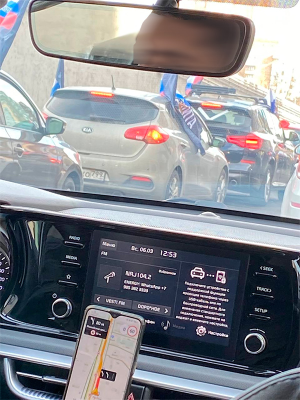 Подруга прислала фото, которое сделала сама из такси - на Кутузовском проспекте едет колонна поддержантов. Все на вражеских автомобилях - мерседесы, порше, BMW. Жигулей пока не видно, но на Жигулях не так удобно быть поддержантом, судя по всему.