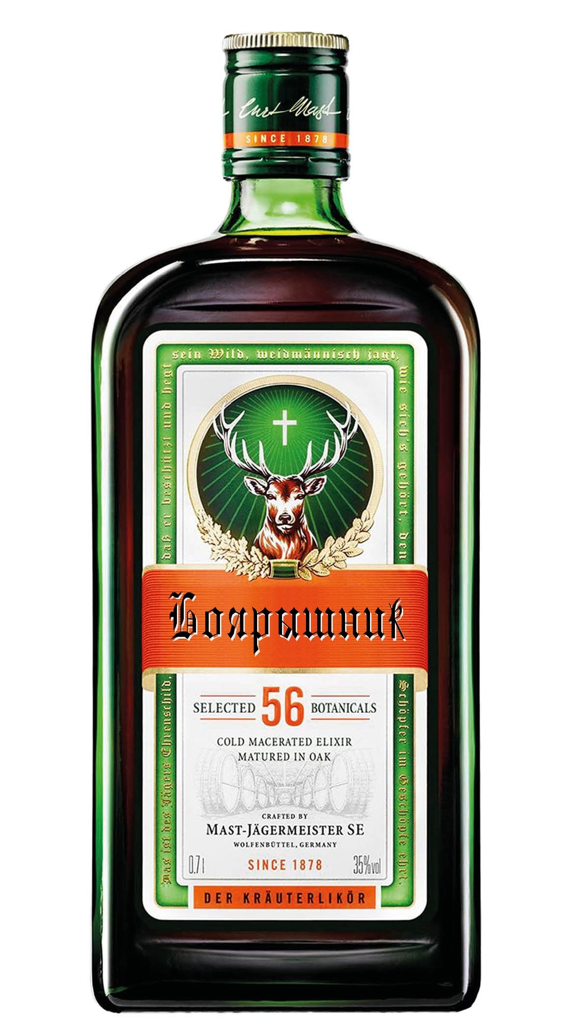 Вот это - бутылка Jägermeister ("Йeгермайстер"), одного из самых популярных в мире крепких ликеров (биттеров), настоянного на травах. Этот ликер получают путем настаивания 56 компонентов в течение 12 месяцев в дубовых бочках. Производит напиток компания Mast-Jägermeister SE из Германии.