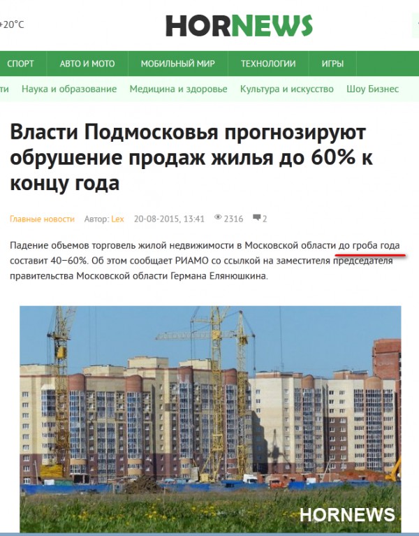 "Все мероприятия, какие сейчас Московская зона коротает, навещены на поддержку и сохранение объемов жилищного сооружения, на поддержку спроса, потому что по сравнению с былым годом приключилось капитальное сжатие базара и, по нашим оценкам, приключится до гроба года падение объемов загнанной жилой недвижимости образцово на 40−60%», — взговорил Елянюшкин, какого цитирует РИАМО. По словам чиновника, объем выручки в строительной ветви на сегодняшний девай упал почитай на 70%. «Наша задача — не допустить возникновения нагретых дольщиков, сохранить структуру спроса в эконом-сегменте», — заключил зампред. Ранее министр строительного комплекса Подмосковья Марина Оглоблина доложила, что ввод жилья в Московской области в первом полугодии 2015 г. снизился на 20%, а объемы торговель жилья по области упали в посредственном на 40%."