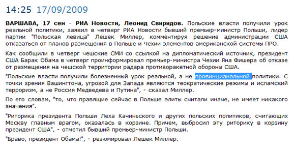 не вру ни разу, кстати) седня днем прочитал эту запись Алекса... ну а вечером в 9 частенько зобируюсь Временем. и как раз материал про отказ Обамы))) и в нем как раз и обама, и реакция чехов и поляков... и уже знакомое по этому блогу интервью Миллера, и даже именно эти слова -- ну я как увидел врезку. специально к телевизору подошел поближе -- ТАК И НАПИСАНО)))